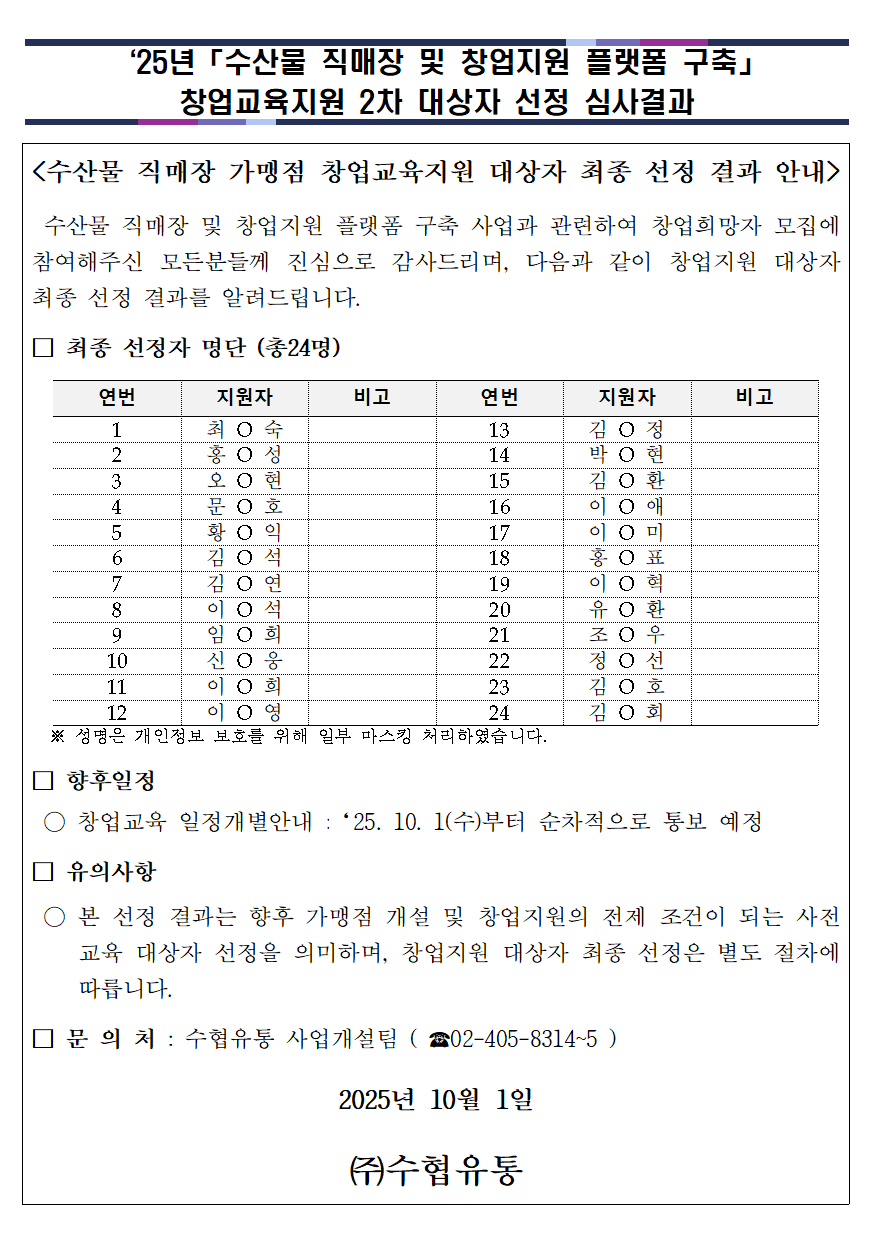¡®25³â¡¸¼ö»ê¹° Á÷¸ÅÀå ¹× Ã¢¾÷Áö¿ø Ç÷§Æû ±¸Ãࡹâ¾÷±³À°Áö¿ø 2Â÷ ´ë»óÀÚ ¼±Á¤ ½É»ç°á°ú
