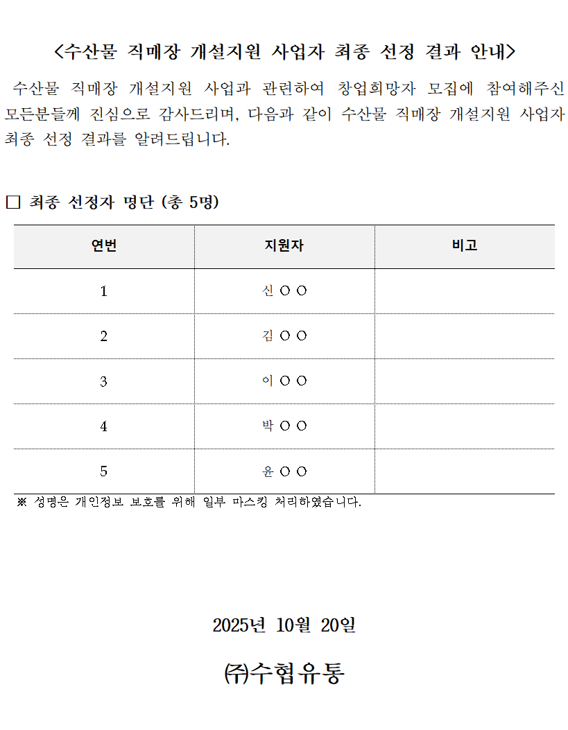 ¡®25³â¡¸¼ö»ê¹° Á÷¸ÅÀå ¹× Ã¢¾÷Áö¿ø Ç÷§Æû ±¸Ãࡹ°³¼³Áö¿ø »ç¾÷ÀÚ ÃÖÁ¾¼±Á¤ °á°ú ¾È³»